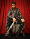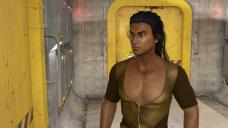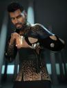 Here's my take on Khan Noonian Singh; Wrath of Khan type wardrobe and hair, but aged more like the Space Seed version. G3M, wearing Sanjay 8's skin. Morph recipe is 60% Ahmad Base head and body, 50% Ivan HD Addon head and body, 50% Sanjay head and 45% Sanjay body, 10% Ahmad Full body, 19% Jaw Height, 300% Eyes Cornea Bulge, -10% each on Eyes Size and Eyes Width, 10% Eyes Outer Width (this is from Dogz's 200 Morphs kit), 50% on Upper and Lower Arms Size (and the equivalent thigh-shin-calf morphs but you can't really see that from the pic).