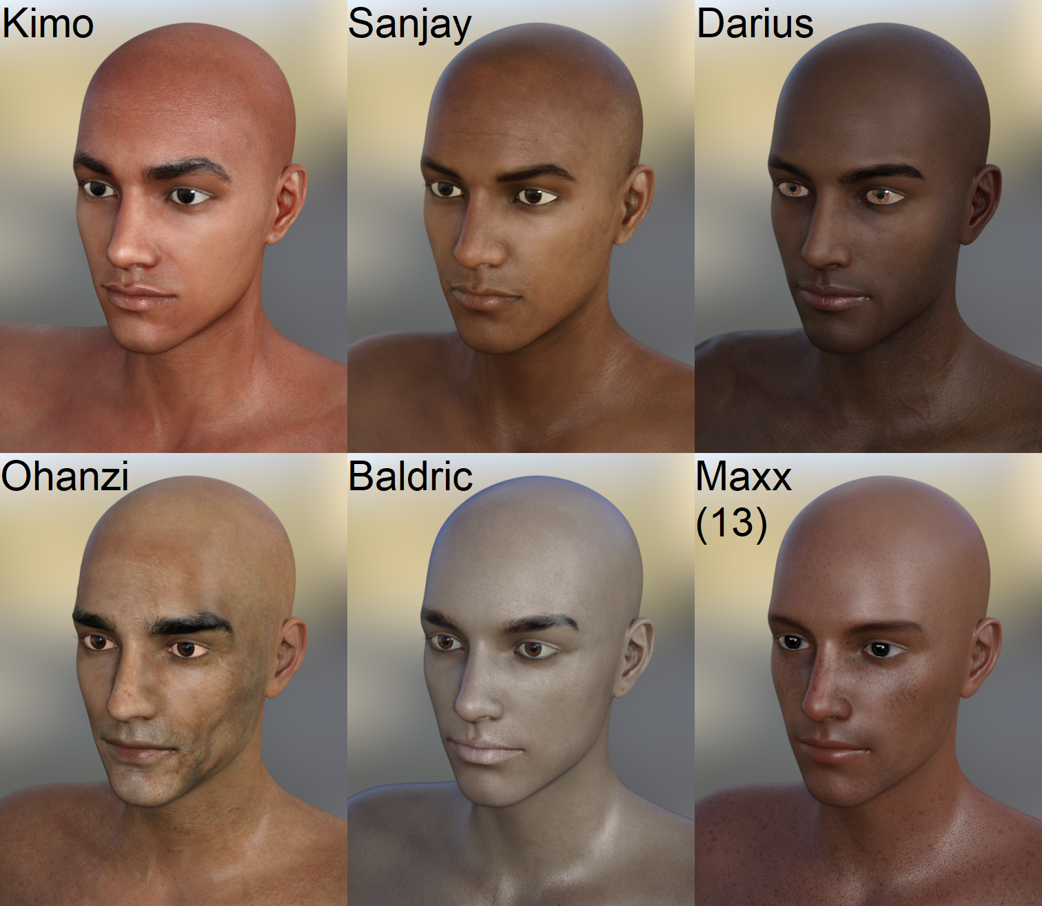 This test render was originally just to compare Kimo and Sanjay's skins on the default G8M, but I ended up throwing other similar skin-tone characters into the mix, including Darius 8.