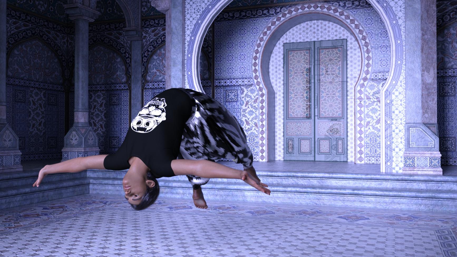 Unrelated: I wasn't wild about Devansh initially, but after transferring him to G3M and playing a bit, I like him a lot better. Here he is with a pose from the Bollywood set in the pro bundle, and Aave Nainen's DForce East Meets West outfit and DForce Sanjay Hair. Dforce simulation, simulating outfit and hair took about 30-40 minutes (i7 with 16G RAM and GTX 745), and led to the results seen here. Basically, Sanjay Hair seems to be meant to save you the trouble of messing with movement morphs when you tilt or twist the character's head a bit, but doesn't seem to be meant for radical poses like this one. Unless I did something to mess it up in the course of back-converting, which is always possible.