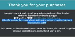 Got the "Thank you for your support" banner announcing I get a $50 off daz originals, but it doesn't seem to work. The banner doesn't say anything about it requiring additional purchases, but also says it replaces the $30 offer for the new figure bundle. So the question is, is this just an upgrade of that discount and I need to buy the bundle for it, or does it just not work as it should? If it just upgrades the other discount, then maybe the banner should say something like "with the purchase of the bundle", because in that case I got excited for nothing :p