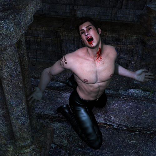 The first image seemed to feature the girl more than Hugo, so I did a second render. In this one, I made use of the blood textures on the mouth, the teeth, and the neck. In this story, he has been bitten and he has feasted on human blood, so is now re-awakened as a full vampire. I'm not sure if that's how it works, but that's what I came up with :)