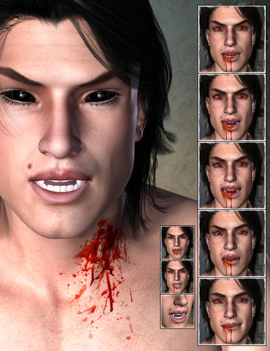 There is a vampire teeth custom sculpted morph, and mat options for the teeth clean or with blood in teeth and tongue.