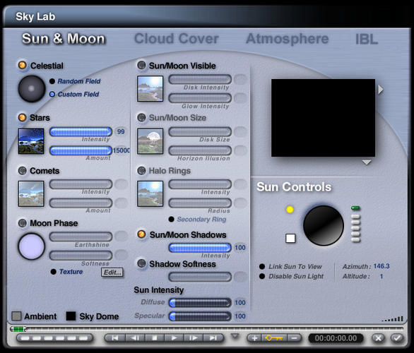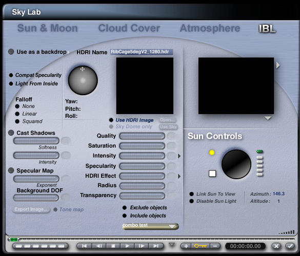 I have a question. I was using the Hybrid Scene Convertor to create a pseudo HDRI background for a Bryce scene I'm working on. Basically the SC scene is the Custom Star field and a large sphere with a picture texture of the moon on it. I have turned the atmosphere off and I'm lighting the sphere with the Bryce sun. The thing is when I render the scene I get a very large white blob in the upper left corner of the render. I am attaching the render along with the setting I'm using. I would like to know what may be causing the blob (actual it is more circular than blobish) and how to remove it. At the same time when I use the created HDRI it does not appear to affect the scene I'm creating.