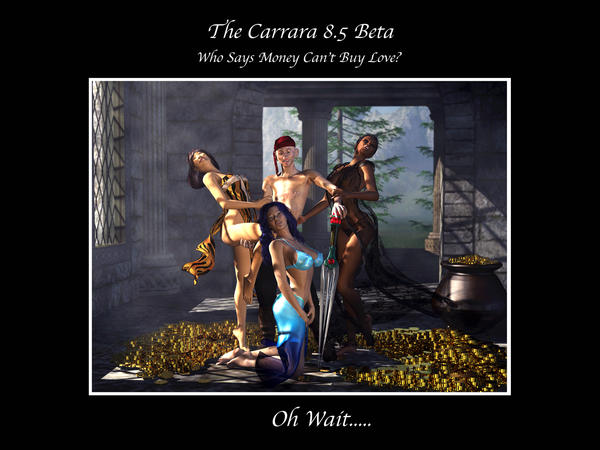 In the meantime, here's one that I did a while ago as a joke advertisement for Carrara 8. I had originally posted it on the old forums, where you had the ability to tag for nudity. I've modified this version and re-rendered with no bare breasts. >:(