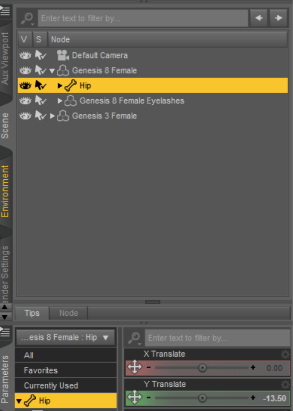 When you use the G8 feemale body morphs height slider, it changes the Y transform for the hip of the character. The image below is from a G8 base set at 100%, so she was shorter. Note that the hip Y transform is now -13.50%. When I set it back to a 0% morph, the hip is back at 0.00%. This hip adjustment does not happen with G3 using the same slider from the G3 version of the morph pack.