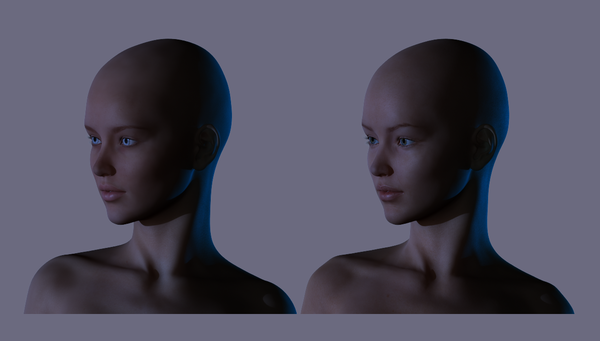My test render was on a naked vicky so I can only post the face. Left is normal right is HD, the face is by far the most noticable for me. Then again the light setup is really not the greatest to see all the details. The improved texture is clearly seen on the breast area even at this resolution, for the face you probably need to render at above 5k on a full body to really see it, but it changes the way light reacts in contact to the skin as seen even at this distance on her face.