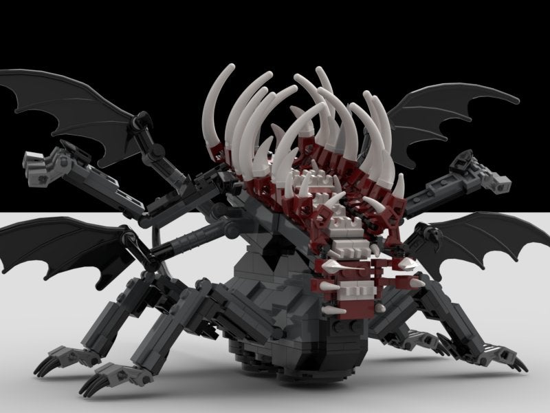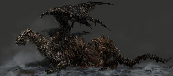 I'm looking forward something similar to Undead Dragon from Dark Souls videogame. It's rotten undead dragon without eyes, and most of muscles and skin is also gone already, and he lost link between his body parts, so his rear part might move independently, as his "life force" is pure magic (or curse) now.