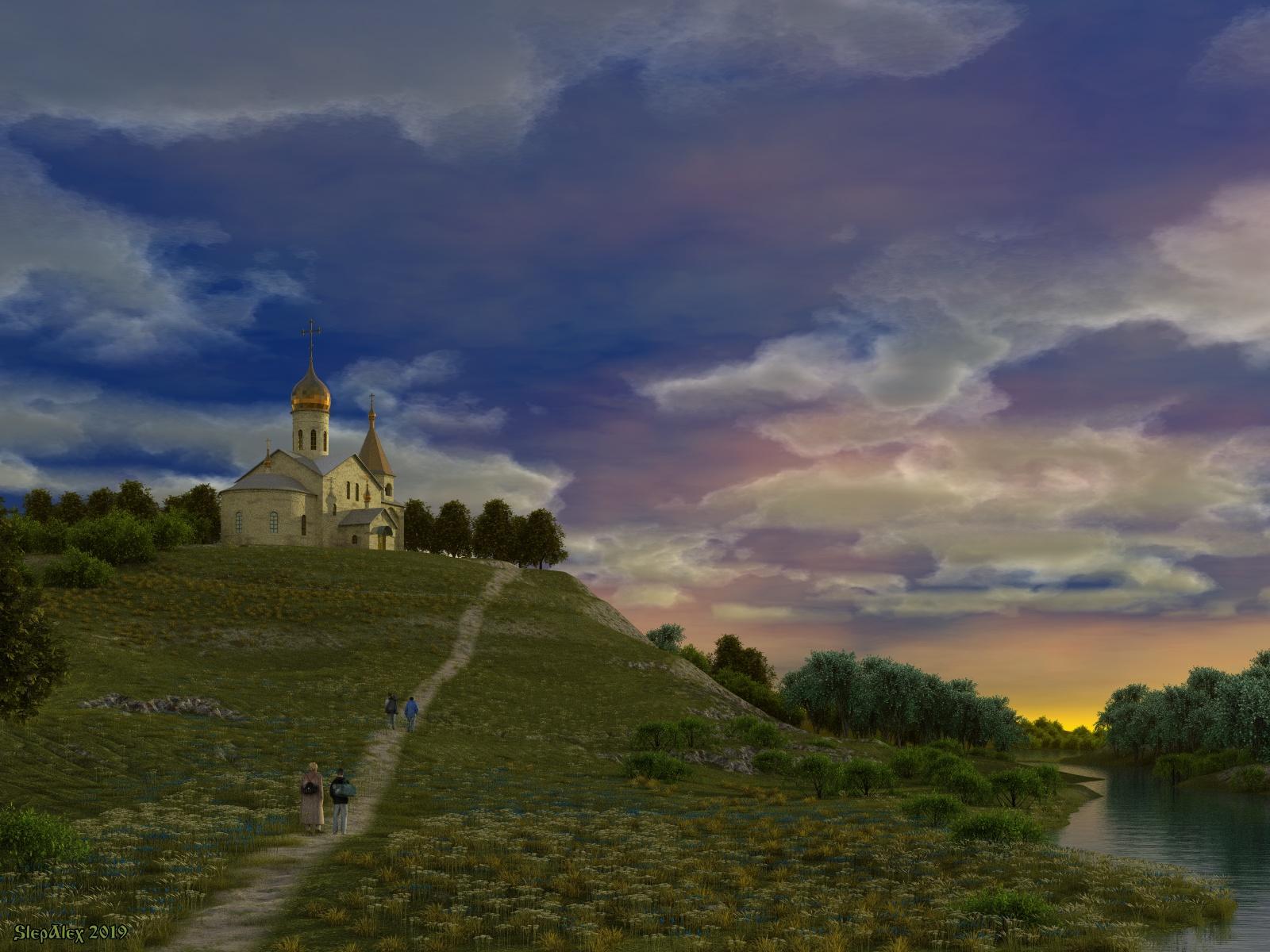 The Russian Orthodox Church in the Byzantine style and grass are modeled in Wings 3D. Low poly characters from the network.