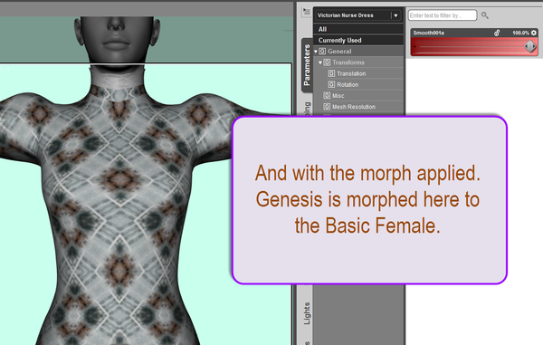 A couple of morphs [one for the dress and one for the apron, not meant to be used concurrently] to smooth out the stretching factor across the front. And some mats which adjust only the 2 Diffuse channels for the Dress with a new texture. Morphs 'n Mats created in the present D/S4.6 edition.