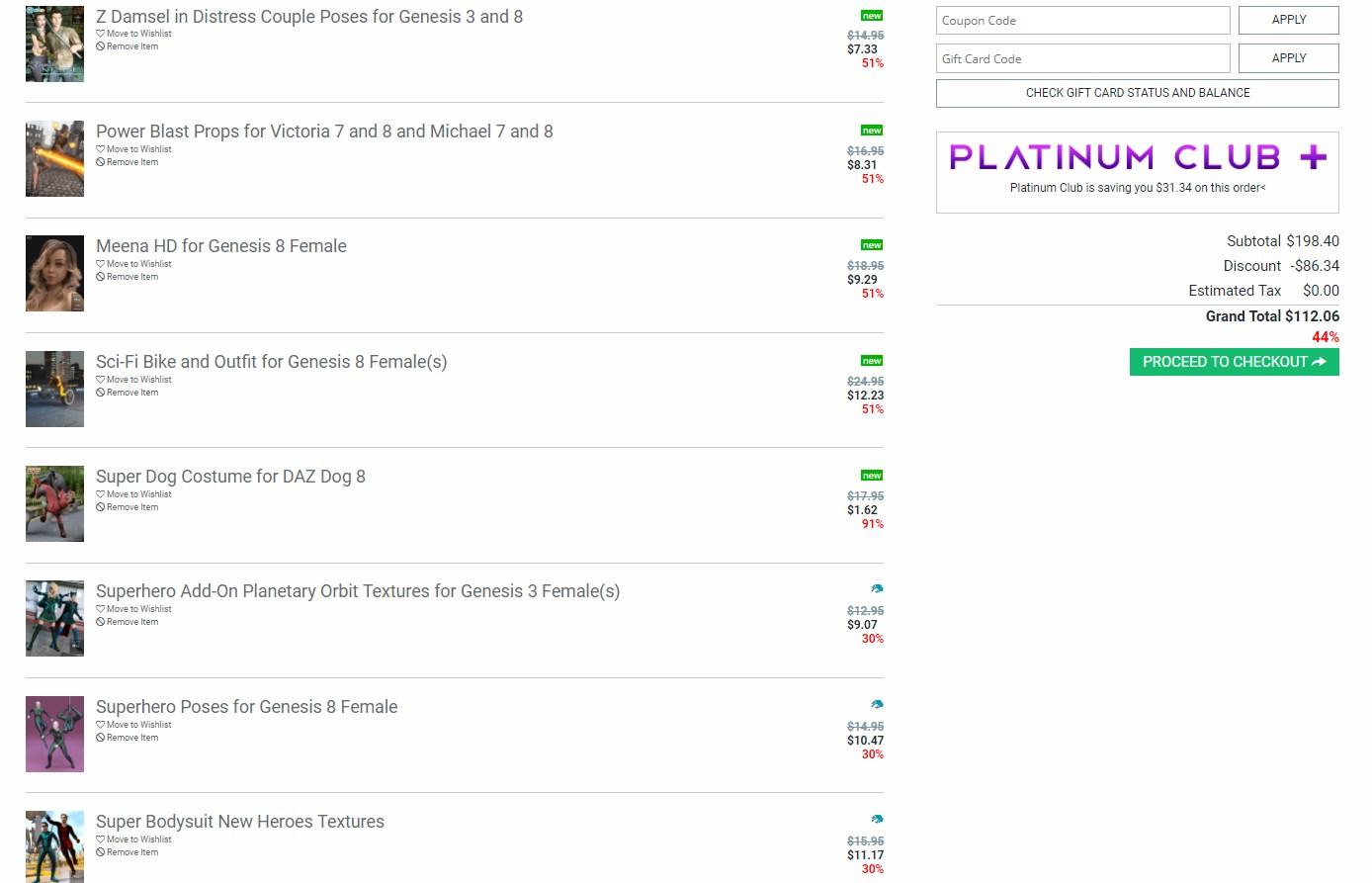 @maildecker, I agree, the buy this & that to get an extra discount often isn't worth it but today with the stacking discount on gift cards it can be quite a saving if you're in the position to purchase a reasonable sized gift card, the two cheapest items (braces and mini skirt outfit) come to $16.09 with the double discount, so a gift card of $51 covers the buy in price, anything over that is 32% free Daz money to use later. Of course if there are a couple of new items you want that are more expensive then it makes more sense to buy those rather than the cheapest.