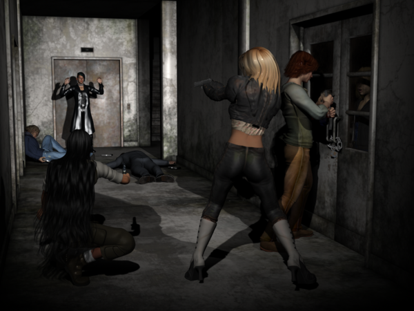 It was early on the morning of the fifth day of their captivity. One of David's 'goons' (neither girl had ever learned his name, and neither particularly cared to know, other than to make certain that they were spitting on the right grave) had given them their 'breakfast' about a half-hour earlier -- and Laura, for one, never wanted to even look at another Egg McMuffin, ever again -- when they heard a commotion in the hall outside their place of captivity. Shouts, running feet, the sounds of a brief scuffle, finally punctuated by several gunshots. The girls rushed to the door to see what was going on.
