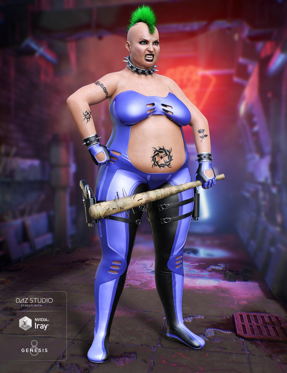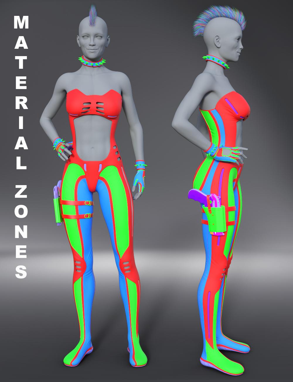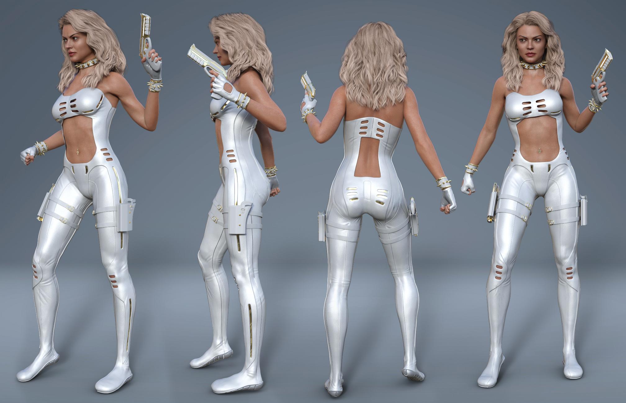 Widow Slayer for Genesis 8 Female(s) is the new outfit from Midnight_stories. A mixture of sci-fi and fantasy with great accessories. Comes with a suit with built in shoes and gloves, left and right guns and holsters. There are gun grip poses plus a safety grip as well. There’s gothic accessories with spiked collar and wrist bands plus a crucifix navel ring. Suit and gloves come with 8 material presets. And Mohawk Hair as a freebie to make your own cyber punk character. This works great with the new Trillian character.
