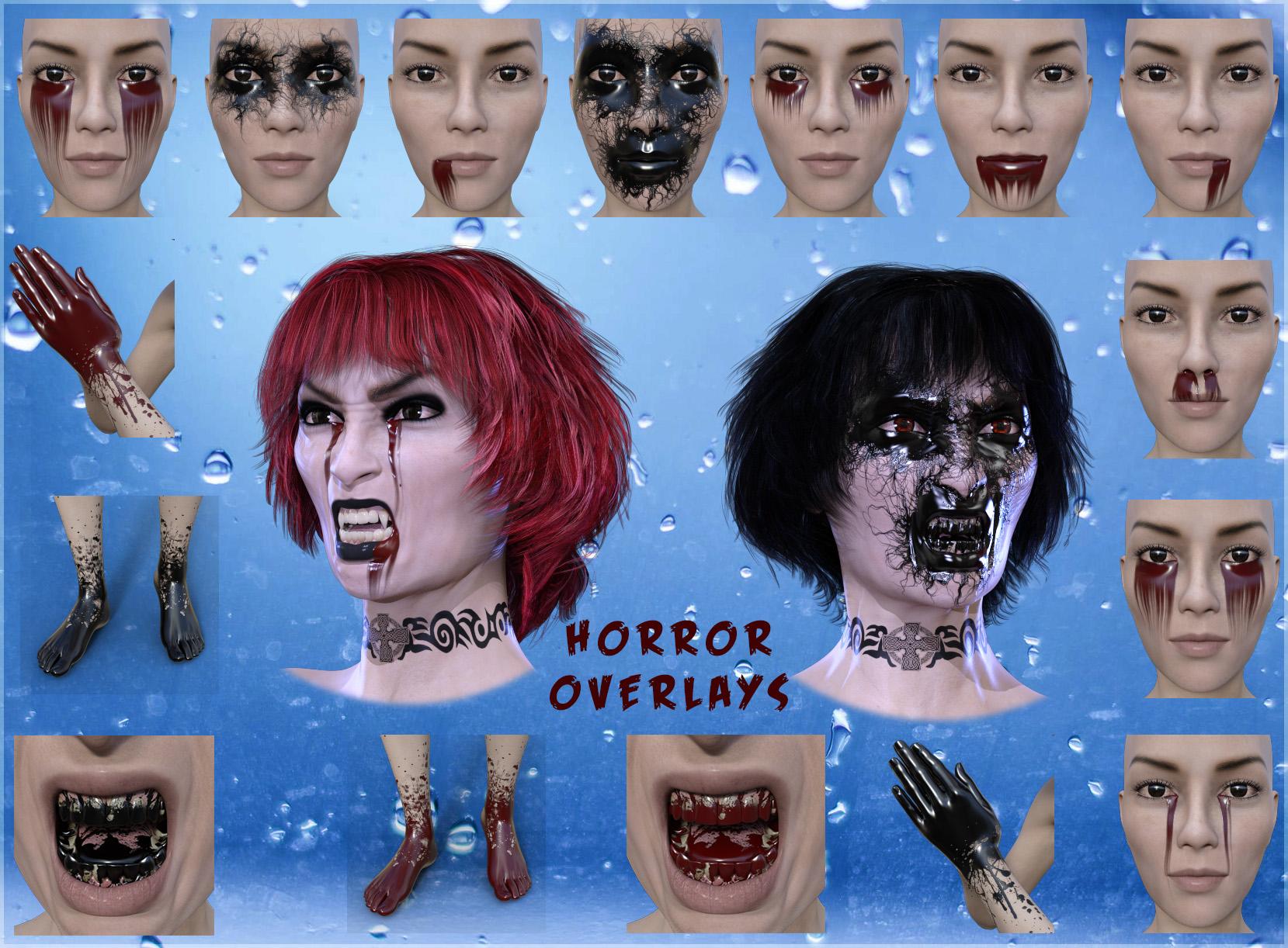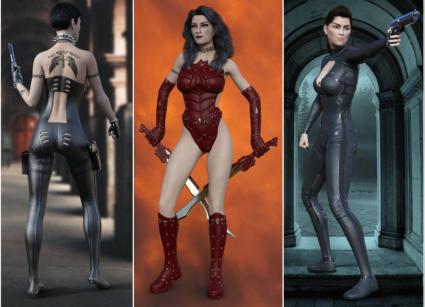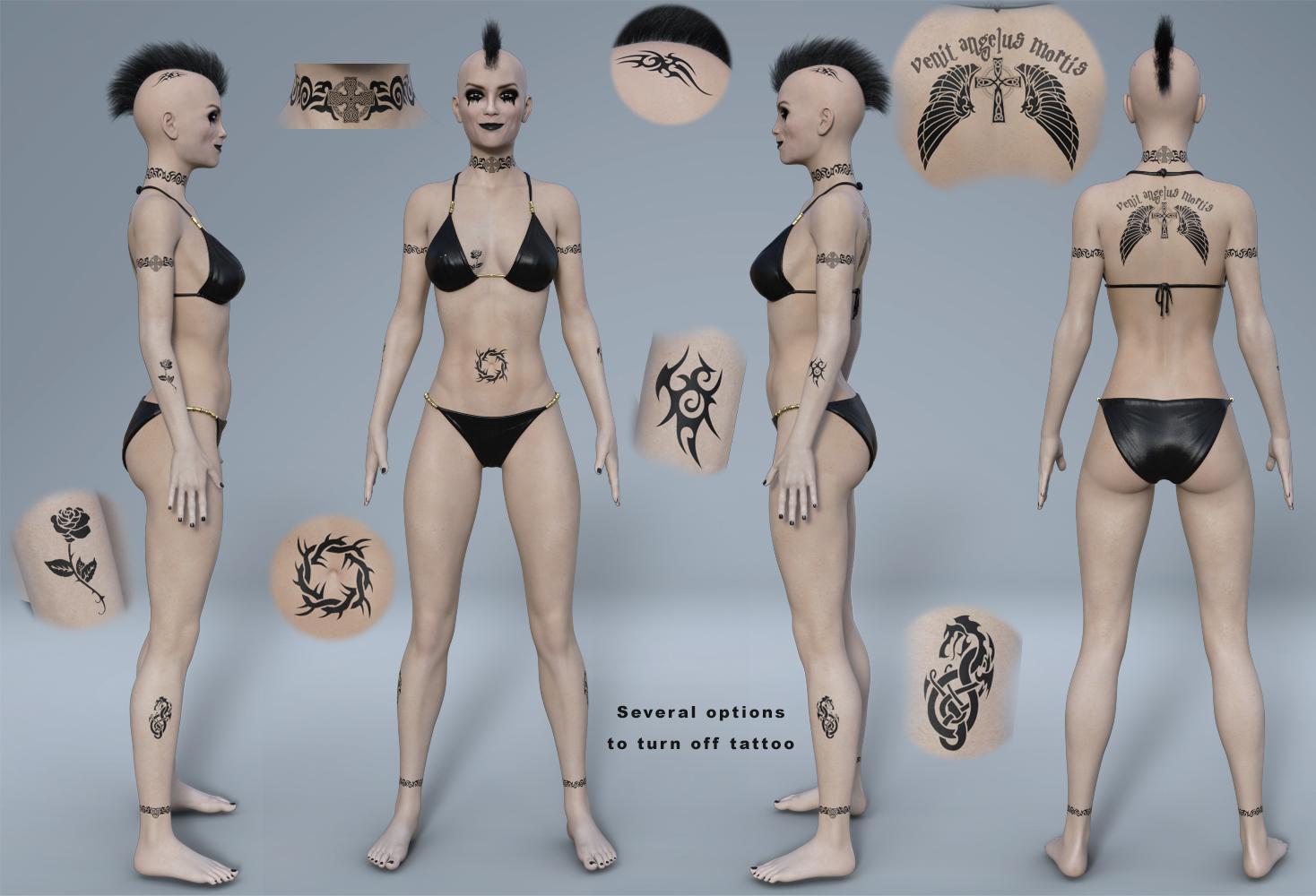 Trillian is a new figure shape for Genesis 8 Female, she’s lean athletic and feminine, all in one. But be weary of her beauty, she has fangs that will bite. She has a pale skin complexion and gothic make up, with 8 eye colors. There’s a full set of tattoo overlays in the style of John Wick. She stand sightly taller than Victoria 8, with separate head and body shapes and a set of Vampire teeth. There’s a Free Horror Overlay set which uses a Geo Shell to sit on top of the figure, so you can use this set with any Genesis 8 Female figure. There’s blood for the face arms legs and mouth, plus a black virus overlay. This will work perfectly with the new “Widow Slayer” outfit. Create your own underworld character.