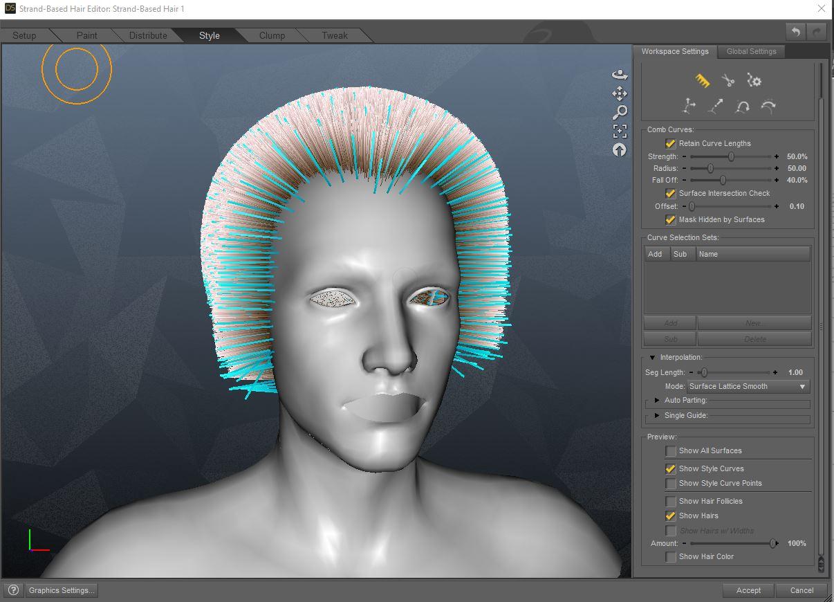 Refine the shape until you have a general shape that you like. If you find you've pushed the hair into the scalp, you can use the Comb to fluff it up and out of the skull or you can use the "Curl Curves tool" (looks a bit like a fish hook) at a negative value to pull the hair out of the scalp. Tweaking and refining the general shape can take a while, so be patient. This is you pretty much sculpting the hair, it may take a while to get it to where you want it. If you find you've really messed up you can just hit "Cancel". If you accidentally hit Accept and don't like the changes, just reload the previous save of the scene.