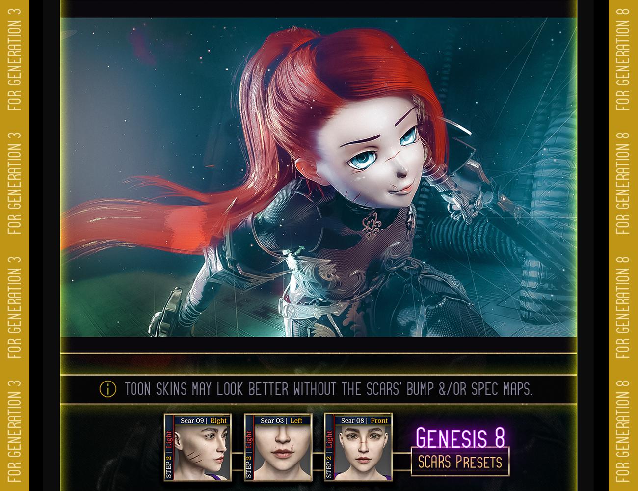 The first in (hopefully) many, "L.I.E. Face Scars for Genesis 3 & Genesis 8" was created with the intention of helping users add more personality to their male & female (generations 3 & 8) characters via a set of 10 hand-painted facial scars. These scars can work together to inject subtext to your images, allowing you to build characters marked by hardships and pain. But who, ultimately, wear the badges life has bestowed upon them. Whether they'll wear them with pride, shame or pain is up to your imagination!