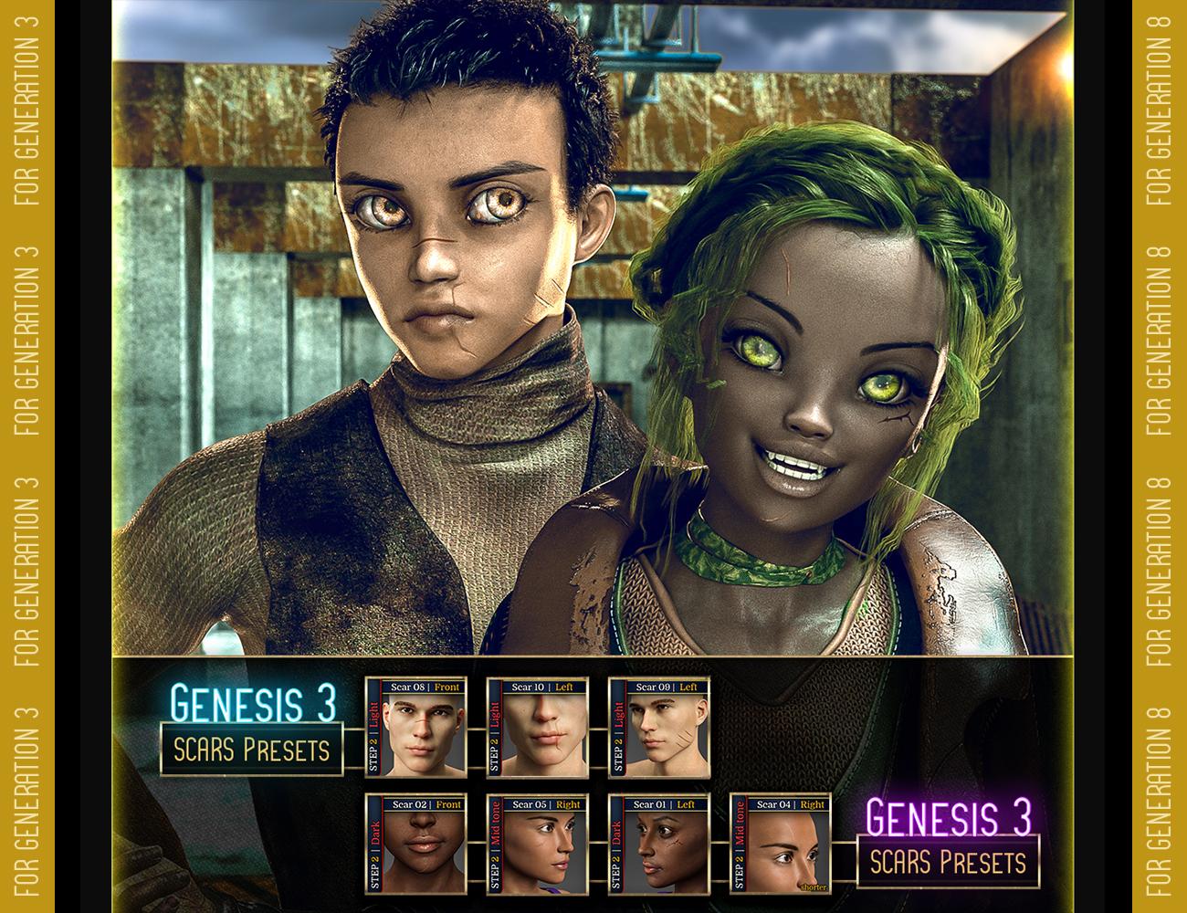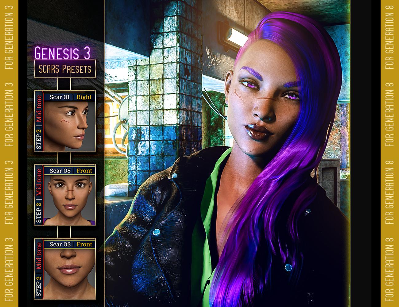 Except for 3 scars, each scar comes with 6 different presets (one per skin color: Light, Midtone & Dark; plus a mirror version for each of them). Scars 02 & 08 don't include a mirror option (they have only 3 presets each). However Scar 04 comes with an alternate shorter version and its mirrors (12 presets per generation).