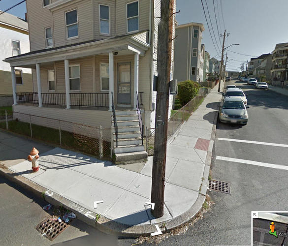 And this is the near death corner. One fine summer day I was cruising down the hill on my street. When I got to my house, one up from the corner, I leaned back on the pedal to brake. It didn't catch for some reason, I continued cruising at full downhill speed toward this corner. Phone pole dead ahead, kittie-corner stairs...the bottom two were stone (it seems they've removed the bottom-most stone step which made this structure stick out even more) and a fire hydrant. I screamed, jammed on the pedal harder as I turned to go around the corner to avoid the pole, and slid onto my side and came to rest between the pole, stairs and hydrant. The street I was heading to was a very busy one. Fun memories.