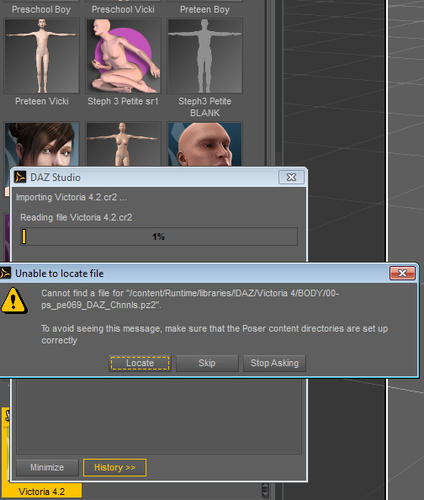 ...complaint. Vicky 4.2 still doesn't load in 4.6 without path errors. A4 and Stph4 load OK but Vicky and G4 don't. Needed V4.2 for the RRRR challenge as one of the draws was Druscilla Goth which doesn't work with Genesis (I also need the morphs as well as the skin maps).
