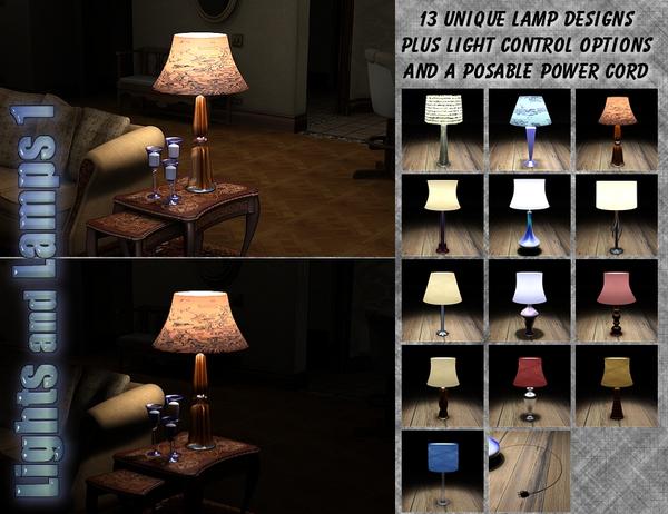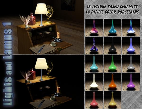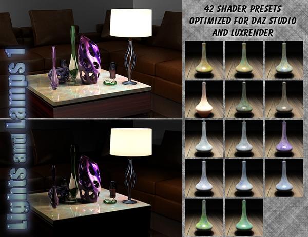 Ever since I started playing around in 3d I've been fascinated by the idea of turning props that were designed to represent things like lamps, chandeliers, wall/ceiling fixtures into actual lights that cast light into your scene. OK, so I've always been fascinated with anything to do with lighting but to create something that looks like and acts like a real light in a render has always been light a holy grail for me. For years I've toyed with different ideas and concepts to create what I was looking for but always with mixed results that I was never satisfied with. Until now. The concept behind Lights and Lamps is to take just about anything that creates light in the real world and create a prop that will look and act the same in your 3d scenery. The 1st edition is a set of 13 lamps, ranging from tiny lamps that you might put on your bedside table up to full sized lamps you might find in your living room. Each lamp has a fully morph-able light shade so that you can give each lamp it's own distinctive style. Also included is a full set of custom lamp shade materials and custom material shaders that, while designed to be used on the lamps, can be applied to any material you choose. Plus you get lighting presets that allow you to simulate putting different real world light bulb strengths in your lamps.