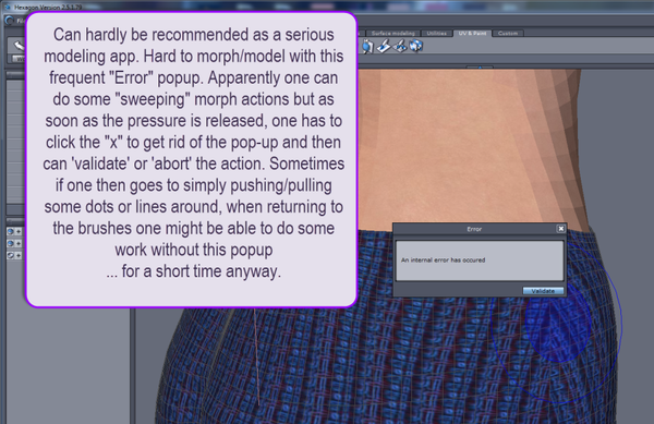 When using the uv brushes [used for morphing and gentle vertex rearranging] and the error messages commence; switching over to simple pushing/pulling of dots and lines ... plus any or all of the usual tricks we try with Hexie [validate; switching from faces to solid to lines to .... ] can eventually get the uv brushes to co-operate again.