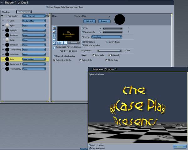 The screen shots show a 2D animated title I made. It already has an embedded alpha channel, so I didn't need to add it into the shader.