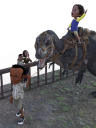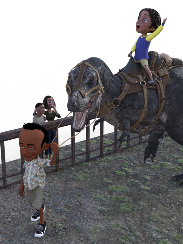 Something I'm playing with at work. I love the range of emotions on display: the boy is having the time of his life, the mom is horrified, the father concerned, and the employee is making barely above minimum wage and could not possibly care less how anyone feels about it. Meanwhile, @Hylas is freaking out because of the contrast between the toons and the realistic dinosaur. I may swap Toon Larry out for either Toon Hero or Boyfriend, possibly aged down to a teenager, because I don't really like the way Larry meshes with the scene. I also need to flesh out the background, but that's a problem for another time.