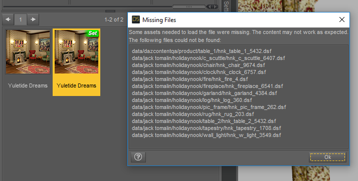 When loading Yuletide Dreams I get a Missing Files error - the files are actually where they're supposed to be, though the first one seems to have a wrong reference (to dazcontentqa/product instead of jack tomalin/holidaynook) in the .duf. Have tried to redownload/reinstall, doesn't help. Anyone else seeing this?