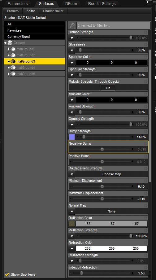 I just loaded the Iray preset again and indeed the shader is called matGround. I changed the base color map to something completely different and it still renders perfectly, LOL, even when removing the map. So obviously a custom shader using a number of layers with masking, and you can't access them? The only thing I found in the shader that actually does something is tiling.