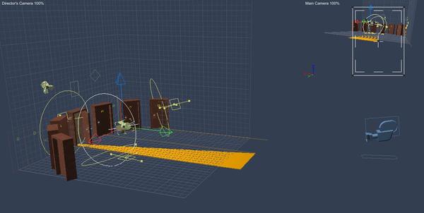 Such a scene is fake, so I could not use conventional lighting. A spot light is for the doors only, another spot light is dedicated to the beam out of door #13, not really a beam but a flat vertex object. All lights have a falloff, so all objects fade to darkness.