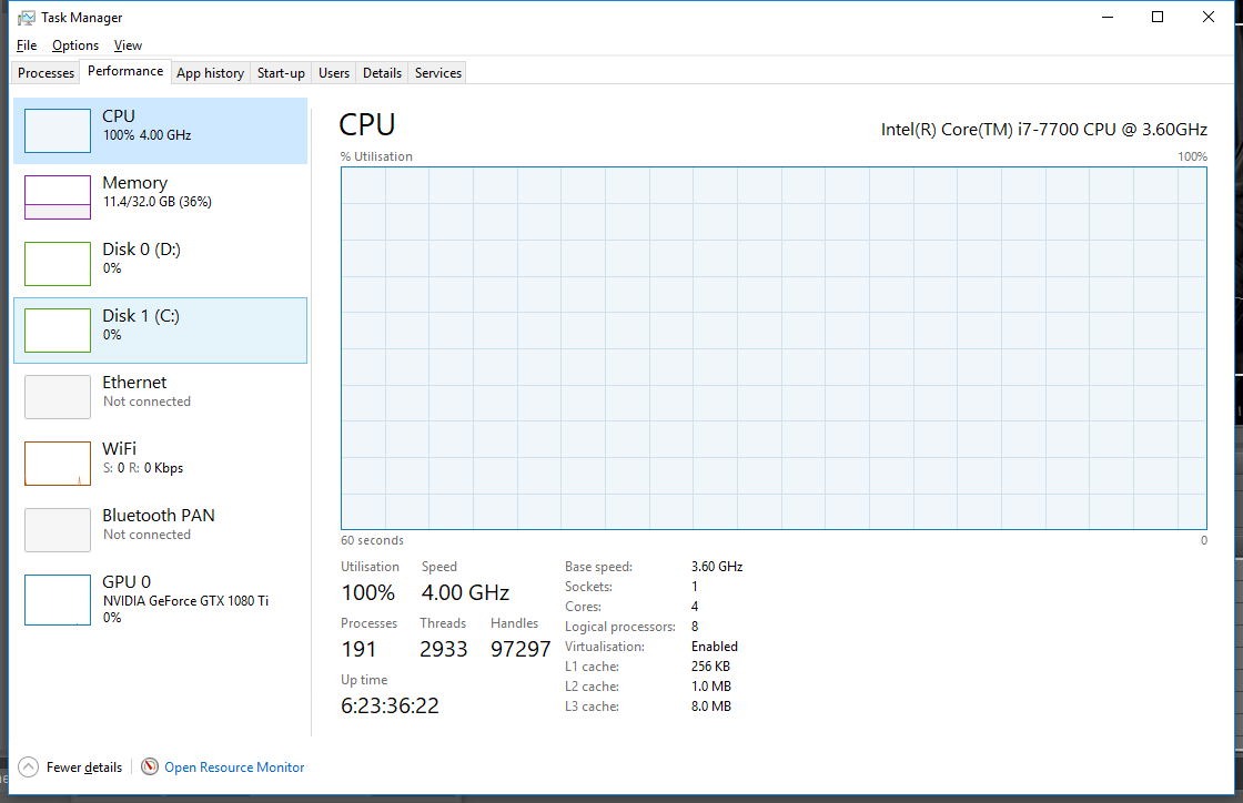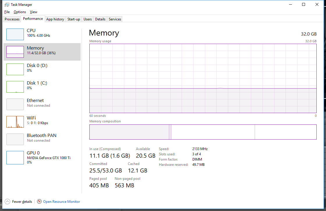 As you can see all the work is done by 4 cores 8 logical processors of the CPU, none by the Nvidia GTX 1080 Ti GPU (only 0.8 of its 11Gb dedicated memory) and is only using 11 Gb having 32Gb