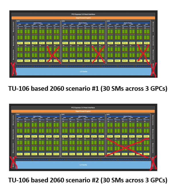 Per Nvidia's parlance, all a Turing generation GPU die has to do in order to qualify as a 2060 level product is contain exactly 30 functional Streaming Multiprocessors (the underlying building block of modern Nvidia GPUs - not individual Cuda cores since those aren't capable of operating on independent workloads) Where these 30 SMs exist physically and how they interconnect with each other/additional processing units isn't ever specified. Meaning that there are lots of potential configurations on a given GPU die generation that could lead to varrying performance figures from identically classed cards.