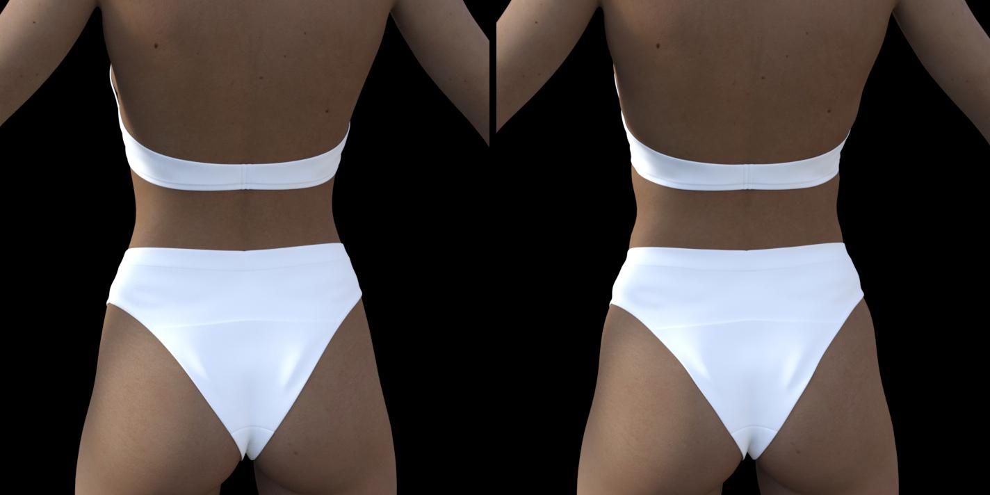 Here Mabel8 on a G3F garment, Pletaix by Powerage, with and without the Pose Control morph. I injected the morph that comes with the pantie over the G3F base and XTransfered