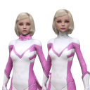 The right side character is taller than the left character, so it's an adult figure that has its morphs added. There's also a noticable cleft in the lower lip, which should help narrow down the cause even further. The eyes are morphed even wider, suggesting an anime style or alien character, with the outer corners pointing a little bit downwards.
