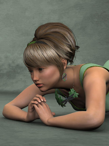 The first image is just using a single Advanced Ambient Light (75% light strength) with hair surfaces set to primitive hit mode - I used Jewell Hair, because it can mostly be moved out of the way to show the earrings more clearly.