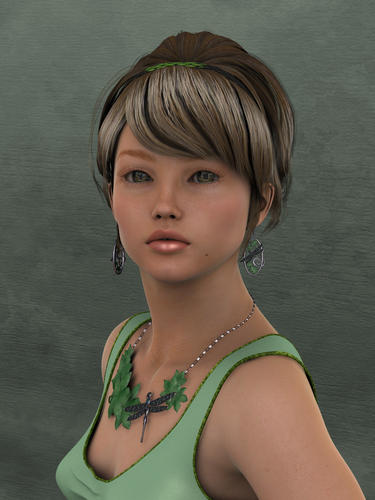 As well as the out-of-the-box materials I've used here, there are several extra materials for each of the 5 styles - the third image shows one of the other mats fot the dragonfly jewellery. Don't judge the hair by this render by the way: I didn't think until after I rendered that I should have made it move a bit better with this pose.