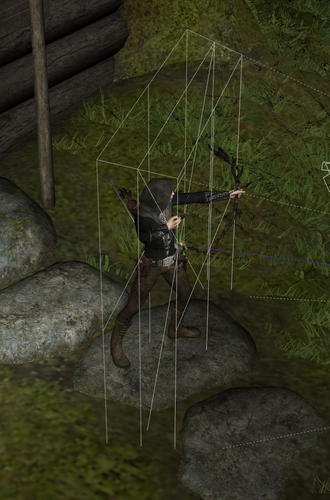 The depth of field is really, really good- sets the tone. I also like the way you didn't highlight the tip of the arrow- the mind does closure and from seeing the bow and shaft the viewer knows it is an arrow, so the tip being in shade makes for very natural lighting. Your character has such concentration, but also radiates confidence. The outfit was a wonderful choice!