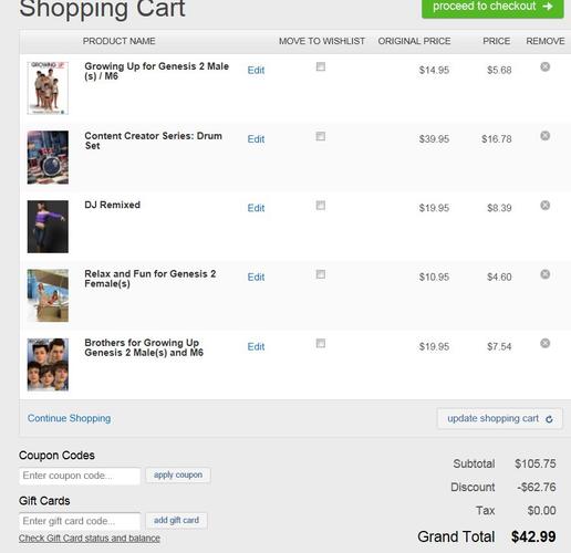 It needs to be the way the cart was when they promised us these stack, and do it the same way. I'm going to NOT use a store that has a certain deal with it, I don't know where you got the $1 off, but my cart was off by more than $1 anyway. Thanks for trying. I need DAZ to answer this- it's really not up to you. (That's a compliment, not a criticism.) So Jared, how do you explain the discrepancies in my first example, based on what the cart was doing, and the new one now? Isn't that what it's doing?