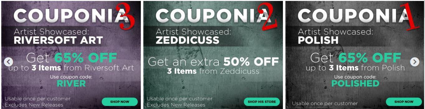FYI: Couponia 2 doesn't have a coupon, you need to put exactly three products in the cart and the discount is applied automatically.