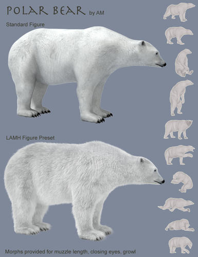 As from the store description: "Polar Bear (Ursus Maritimus) model for DAZ Studio and Poser, bundled with a set of 11 poses and four morphs, and Look at my Hair fur presets to provide a majestic look to the bear."