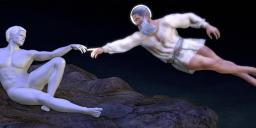 First, on interpretation and meaning: it's probably best not to say too much about this, but I wanted this to have several possible interpretations in addition to the obvious one. It was also my intention from the beginning to leave "Adam" untextured. The rule on nudity was only part of the reason for this.