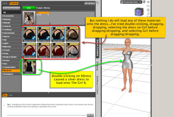 The pic says it all. I can load the dress onto Girl 6 but I cannot change it to a color other than its default silver. I'm trying to use the materials in the Smart Content screen as shown on the pic below.