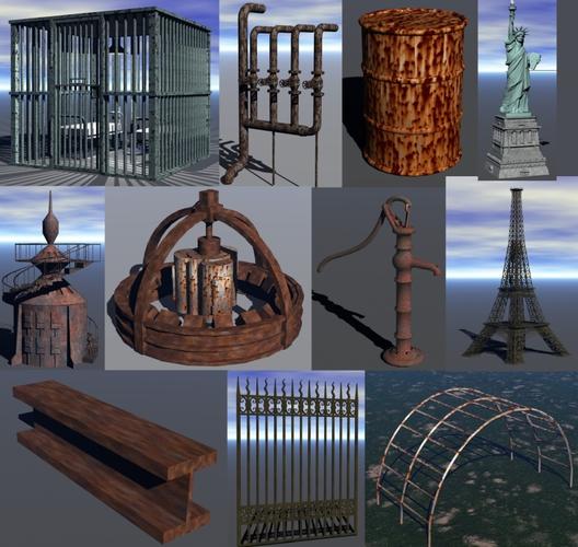 You want feedback? See the enclosed image. I'm havin' the time of my life here! This is great! The wire fence materials are a real time saver as well as being low on the poly count. I sat down and loaded all the files in one sitting this time and now I'm having trouble figuring out just exactly which material I want to use! I'm overwhelmed with choices...which is not such a bad thing. The enclosed is just a really quick render, throwing in whatever I had to see what looked good on what with very little rhyme or reason. The TARDIS was an afterthought....a result of watching the Christmas special, I guess. Anyway, yeah, an index would be good in the future, but not having one hasn't really slowed me down much. I'm sure it'll be a while before I run out of stuff to play with on this set.