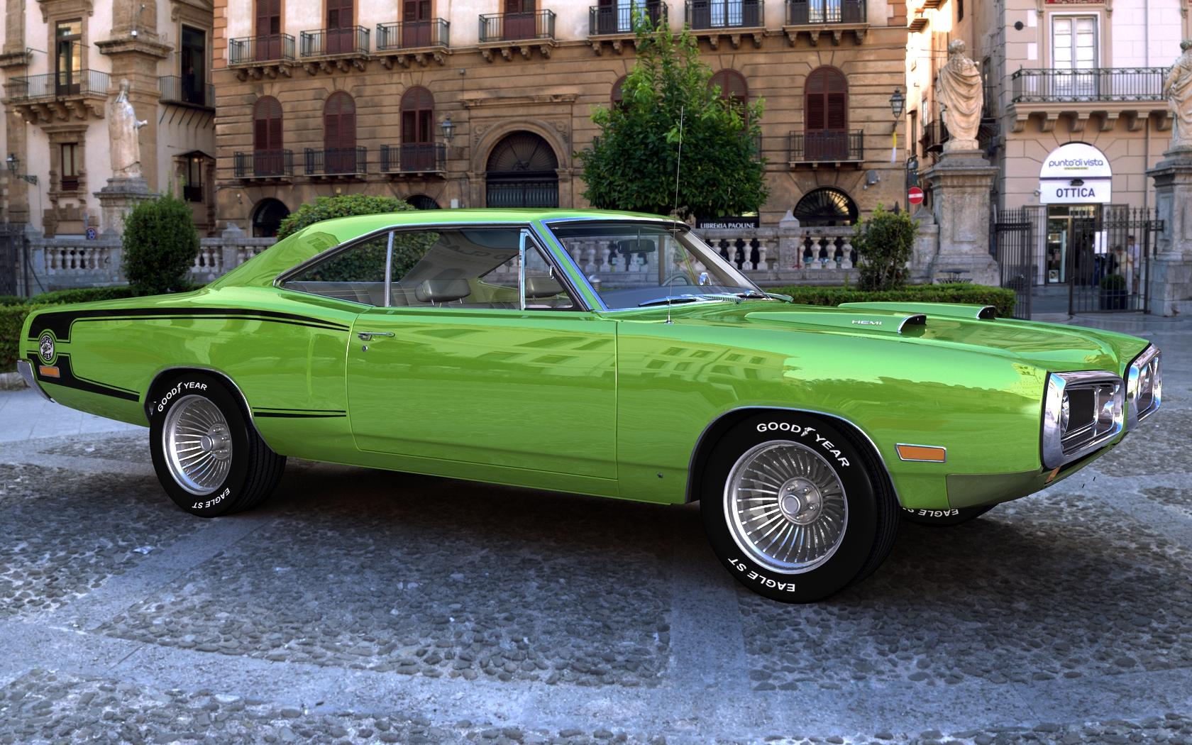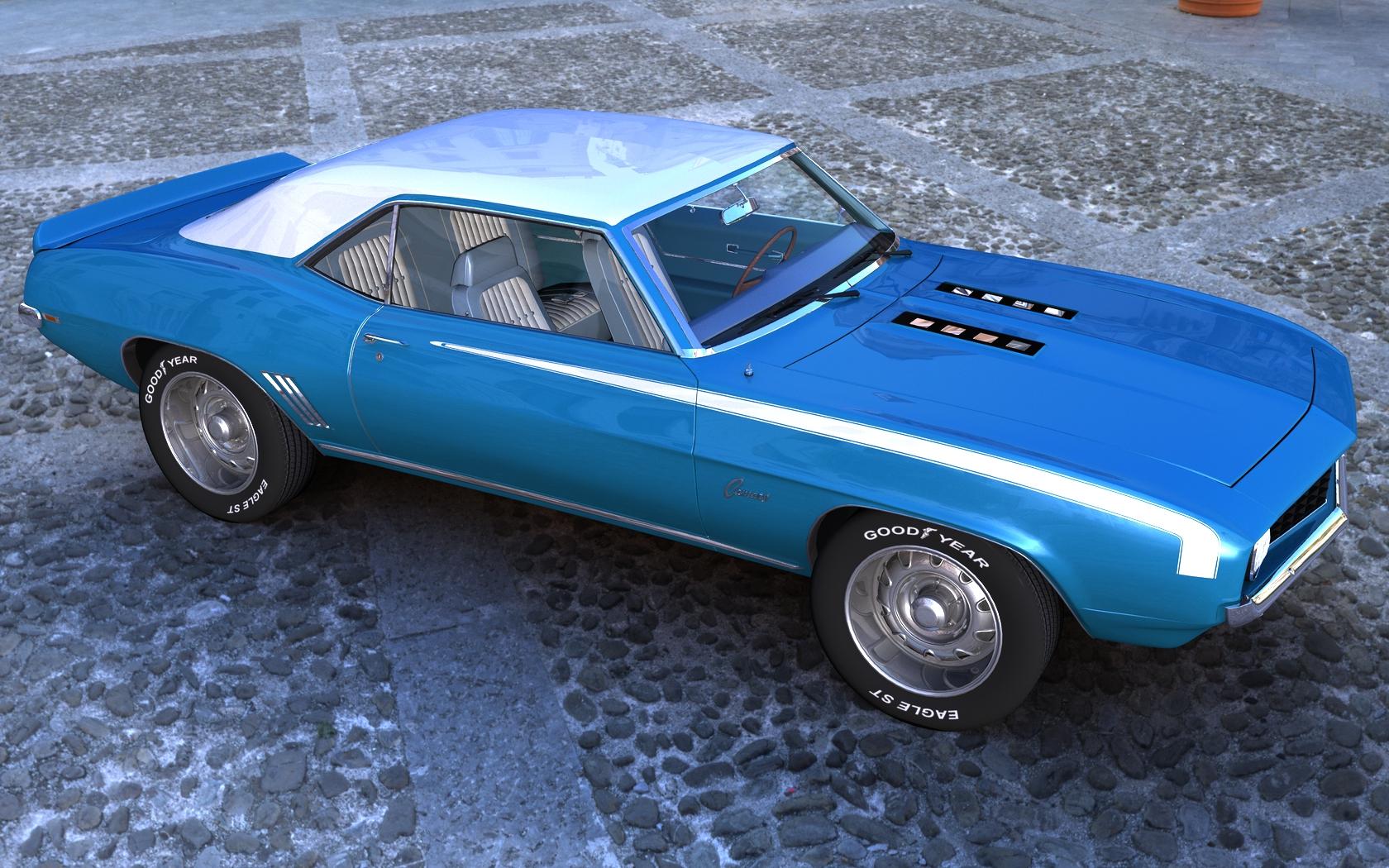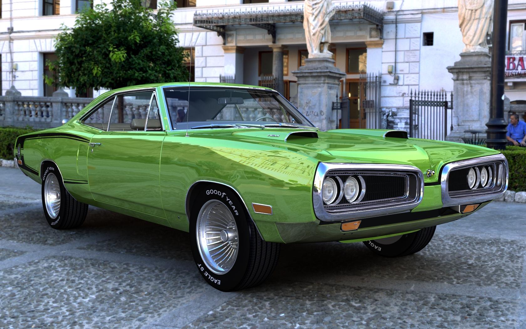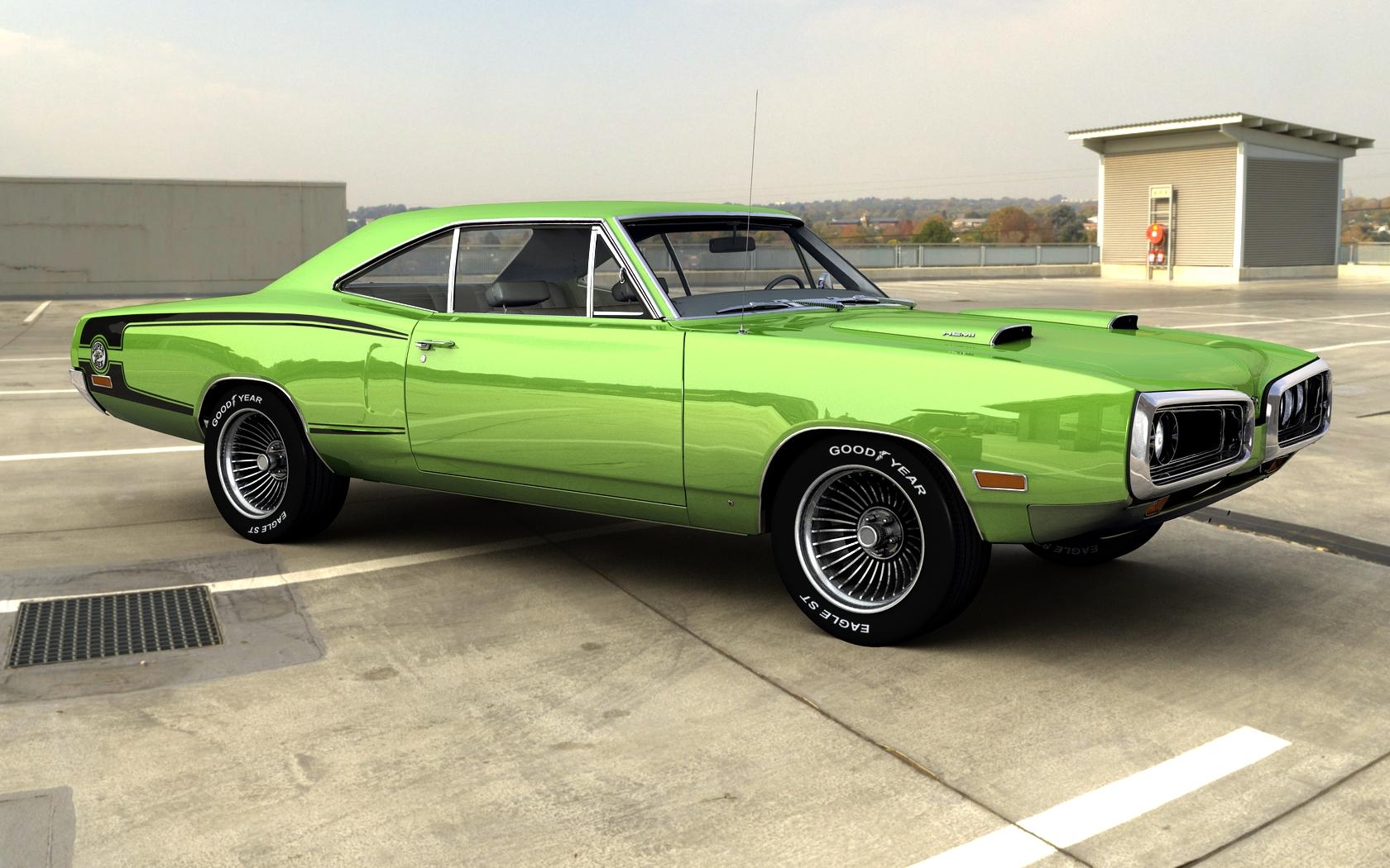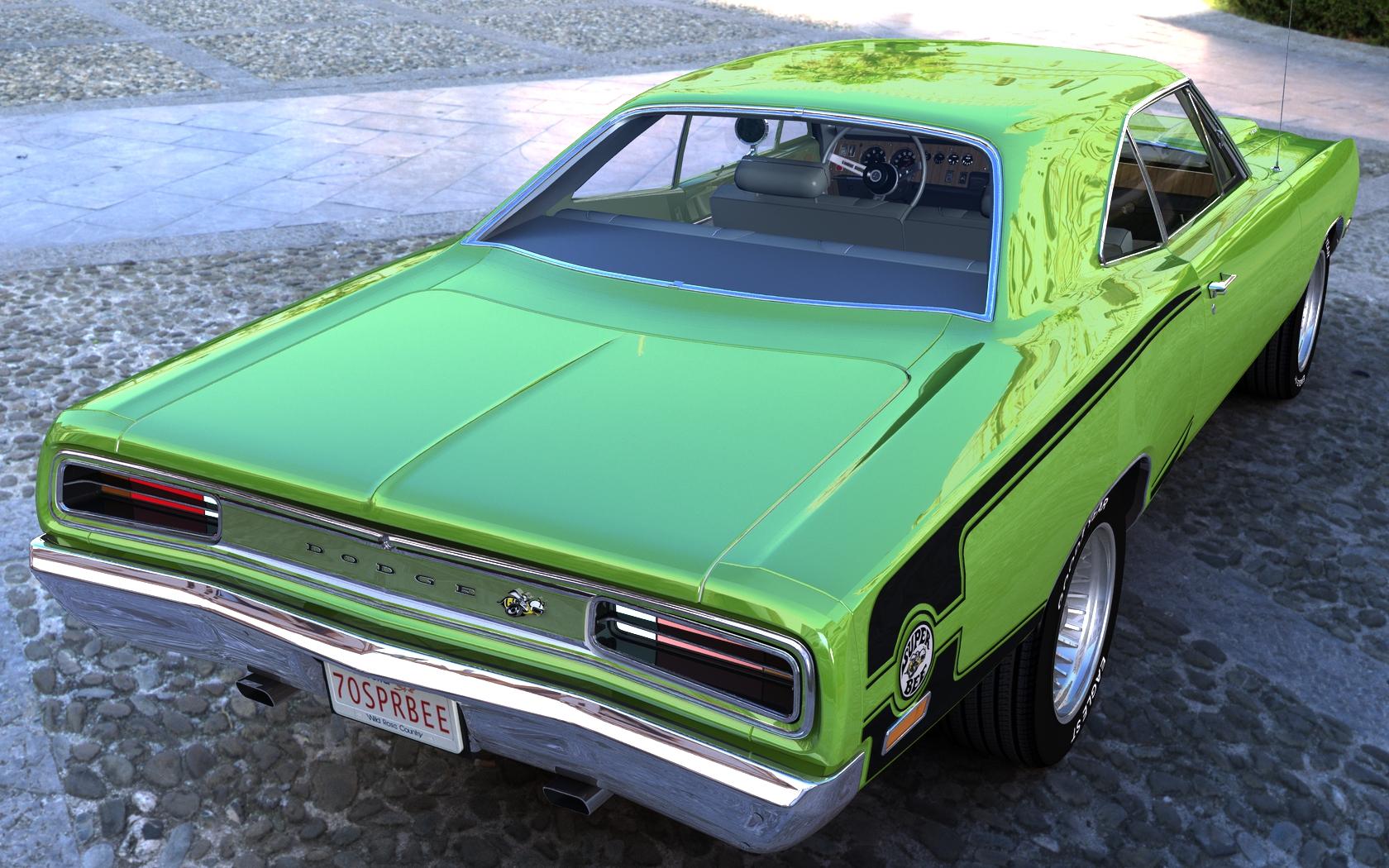 Ok.. this one drove me slightly crazy getting the  superbee logo to work.. took a lot of mask work.. The color is as close as I could get it to the 1970 Dodge Hi-Impact "Green Go" paint. found a color chip and used the RGB values in the paint shader .. I think all the work was worth it..