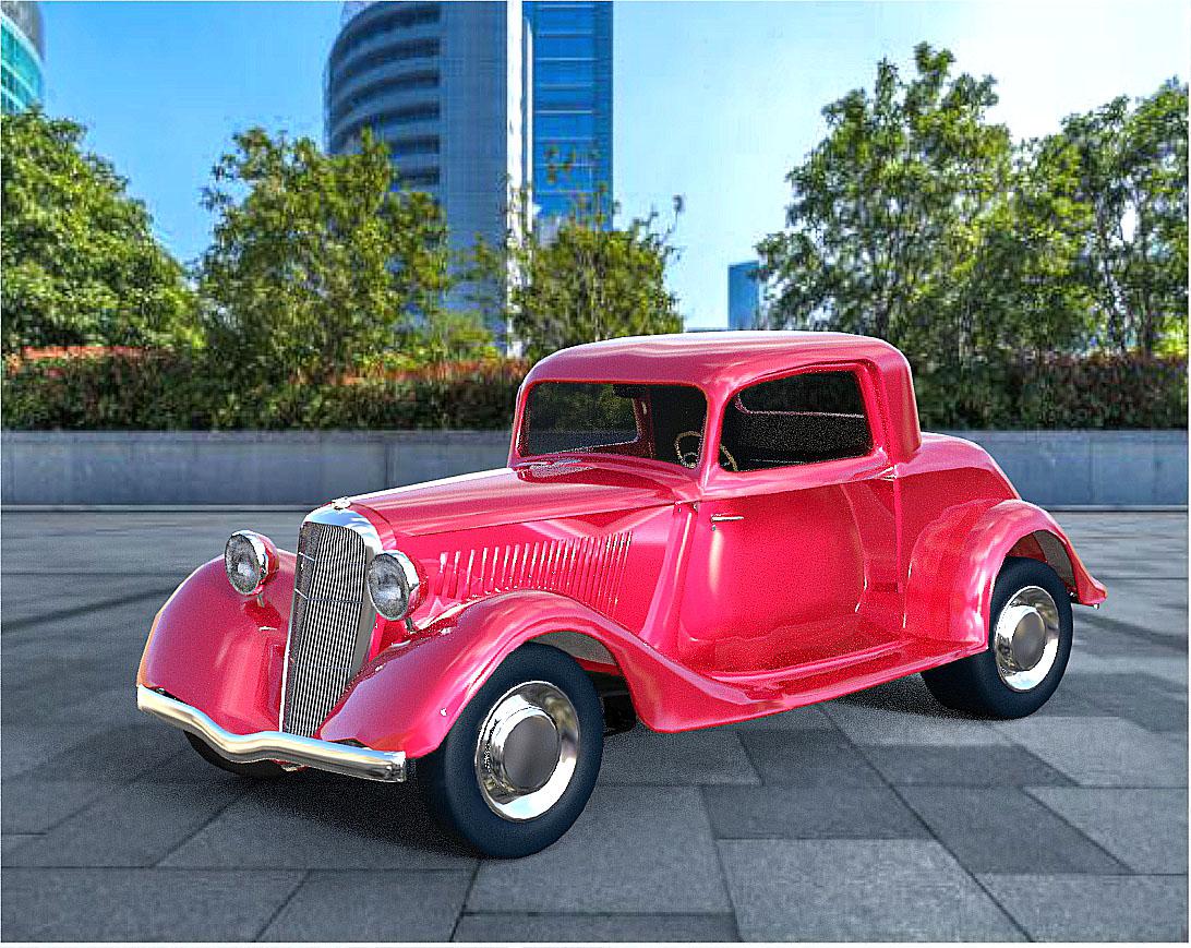 I got this 1932 Ford coupe at a freebie site. It was in .fbx format. Daz 4.15 has the ability to import .fbx files. So, I opened it and it was totally exploded into about 25 parts. Scattered all over the place. But, each part was listed seperately. This gave me the ability to export each part to an .obj file (like you do with the GTA cars in Z brush) No DAM files to delete though...hahaha. Anyway, It has a texture folder with it and I was able to apply them once I imported it back into Daz as .obj files. I had to assemble it though and place each part in place. Once assembled, I applied the textures and used Tom's shaders for the chrome and body paint. Here is the result of about 4 hours work. The engine is a flat head v8 and has great textures for it. Even the block has texture parts on it.