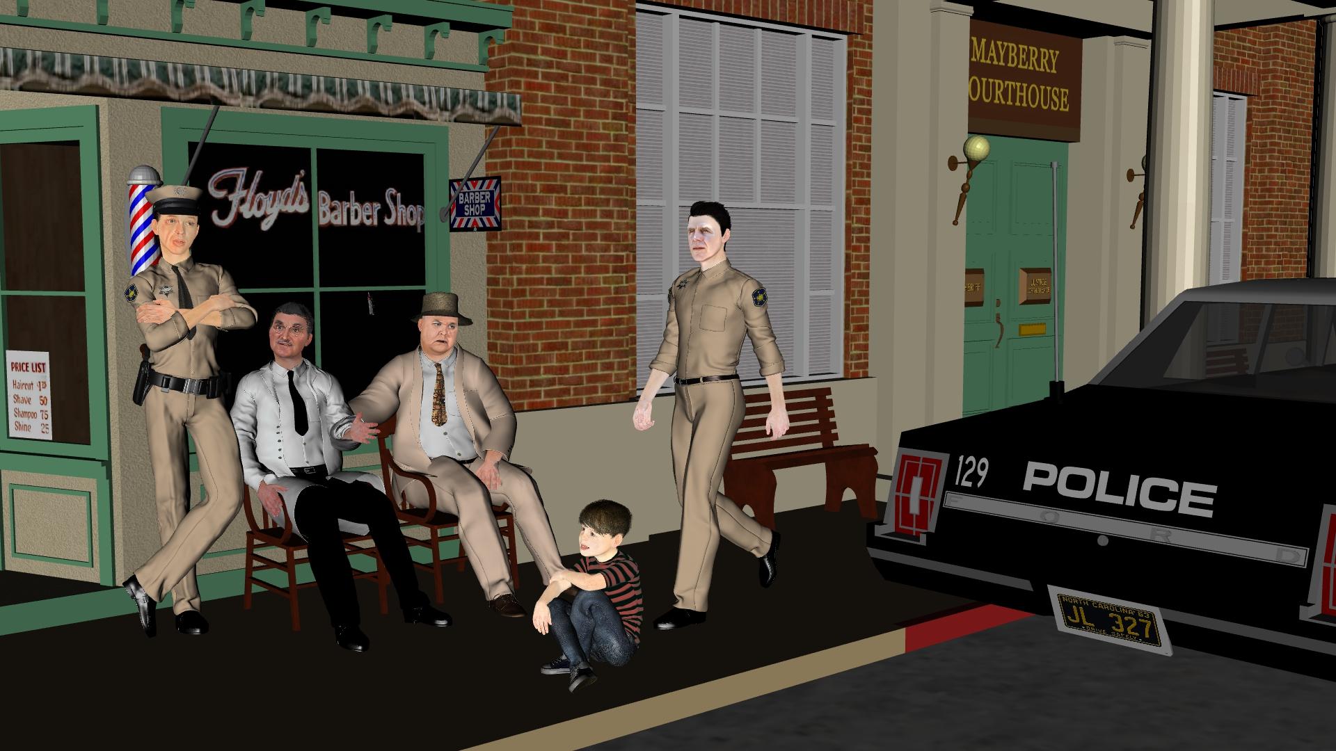 OK....Now this is not car related (other than the Ford Galaxie Police Car here, which I made the Mayberry police decals for the doors just like the show, AND it has the license plate from the show too!) but this is what I have been working on lately. I am still making characters for it and never realized just how many there were. There is the entire Darline family, Ernest T. Bass, Howard Sprage, The deputy that replaced Barney, Aunt Bee and her friend, Andy's first girlfriend the lady pharmasist (daughter from Father Knows Best), Helen Crump, Thelma Lou, Goober, Gomer Pyle, The Mayor, Wally from The Gas station, mean old Ben, and more. Here is a render I did in OpenGL of them hangin' out with Floyd the Barber. Opee is there too. That's Otis Campbell sitting next to Floyd. I am loving this. Too much fun!