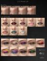 Various make ups (LIE and Diffuse Overlay Presets), glitter materials for the eyeliner and eye shadow materials (although be aware you can only use one at a time with the set up provided), tattoos, nail polishes and skin settings create a versatile pack for your Genesis 8 Females.