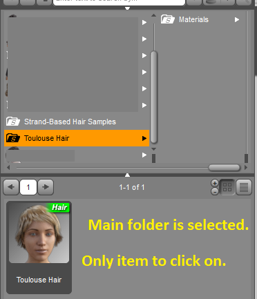 Slow down, when you select the main folder, there is only one "hair" ... load that figure. Then in the scene tab select the Toulouse hair, then click on any of "all the hairs" in the sub-folder to change its colors. When clicking on mat files with their own target obj not selected, nothing happens.
