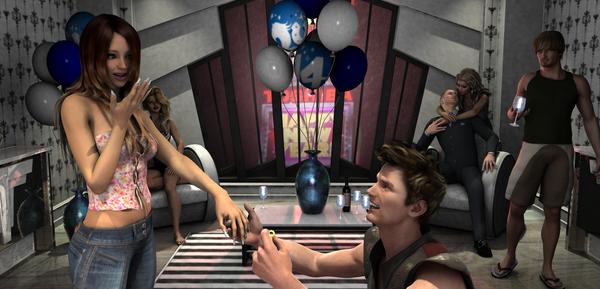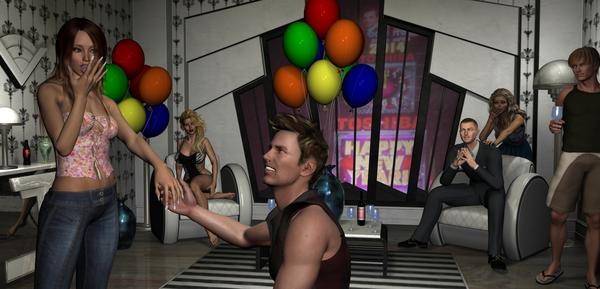 Ok I made several pose tweaks, colored the balloons to match the decor better, changed the camera angle a tiny bit, created a ring for him to present to her and she appears more "pleased" about the situation.