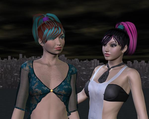 I like the lighting in the 2nd one. Changing the angle on the head of the redhead gives a better view of her face.
