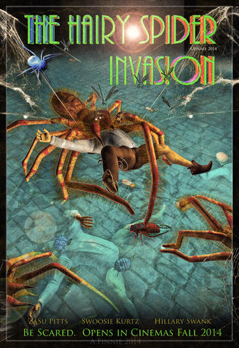 The spider was made and painted in 3dCoat, the hairy-ness was done in Carrara. The set and bathtub was made in Carrara, the tub legs in 3dcoat. Bubbles were Carrara glass spheres altered in Photoshop. Title was rendered in Cararra and composited in PS.